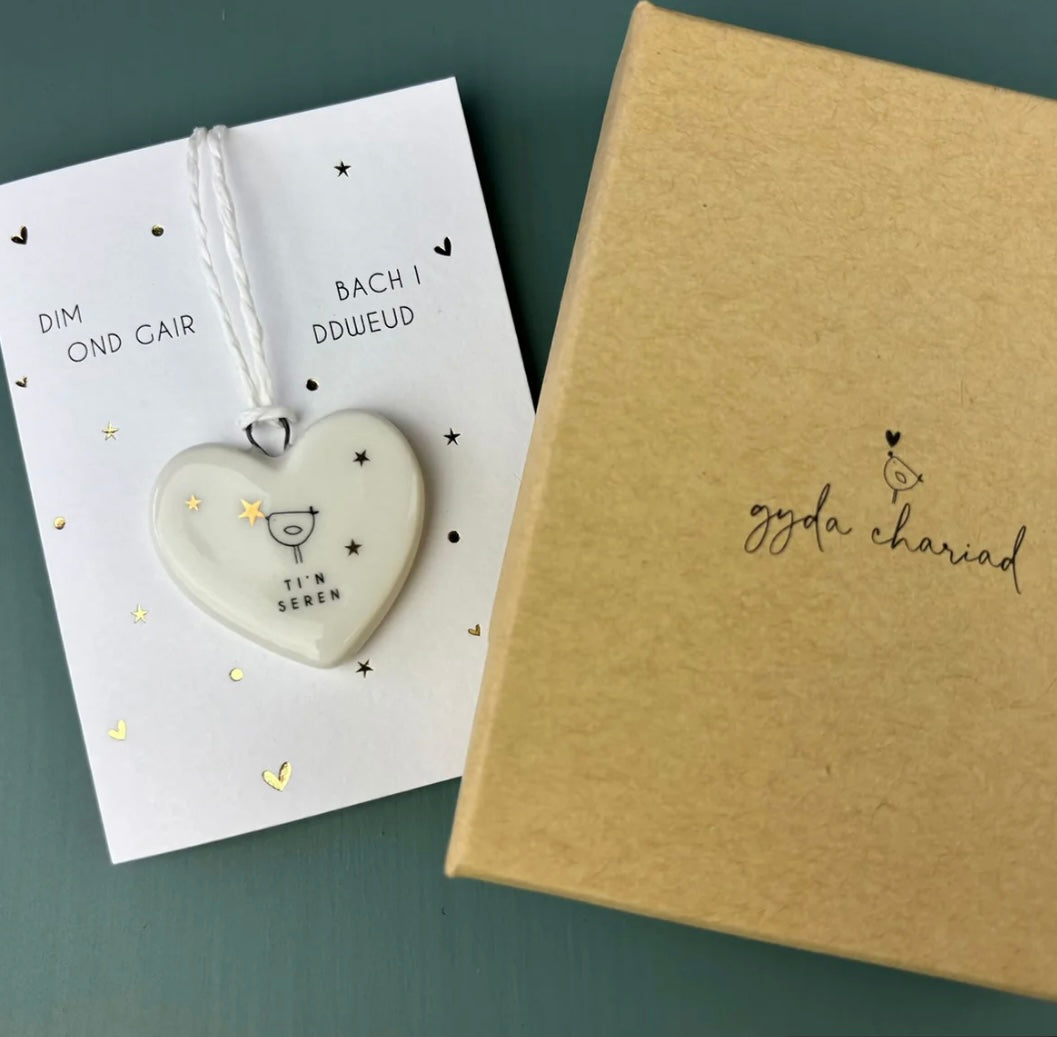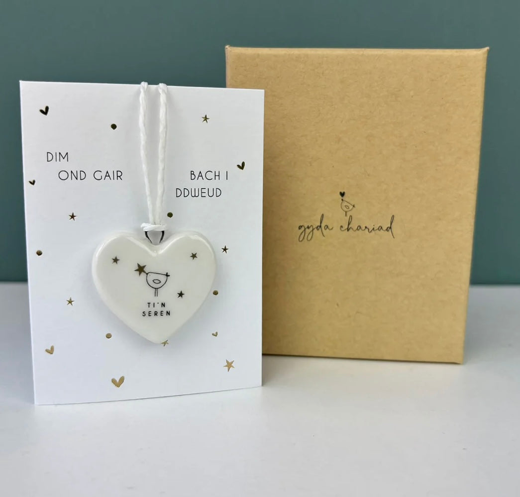 Ceramic heart decoration featuring the words 'you're a star' in Welsh - Ti'n seren, presented on a greeting card with the words 'just a little note to say' in Welsh - Dim ond gair bach i ddweud, complete with gift box.