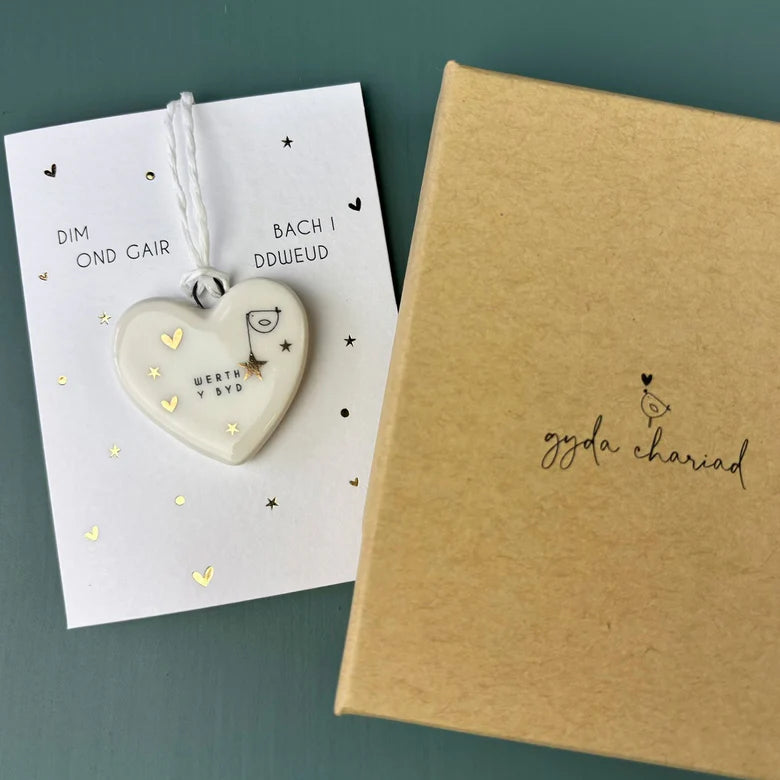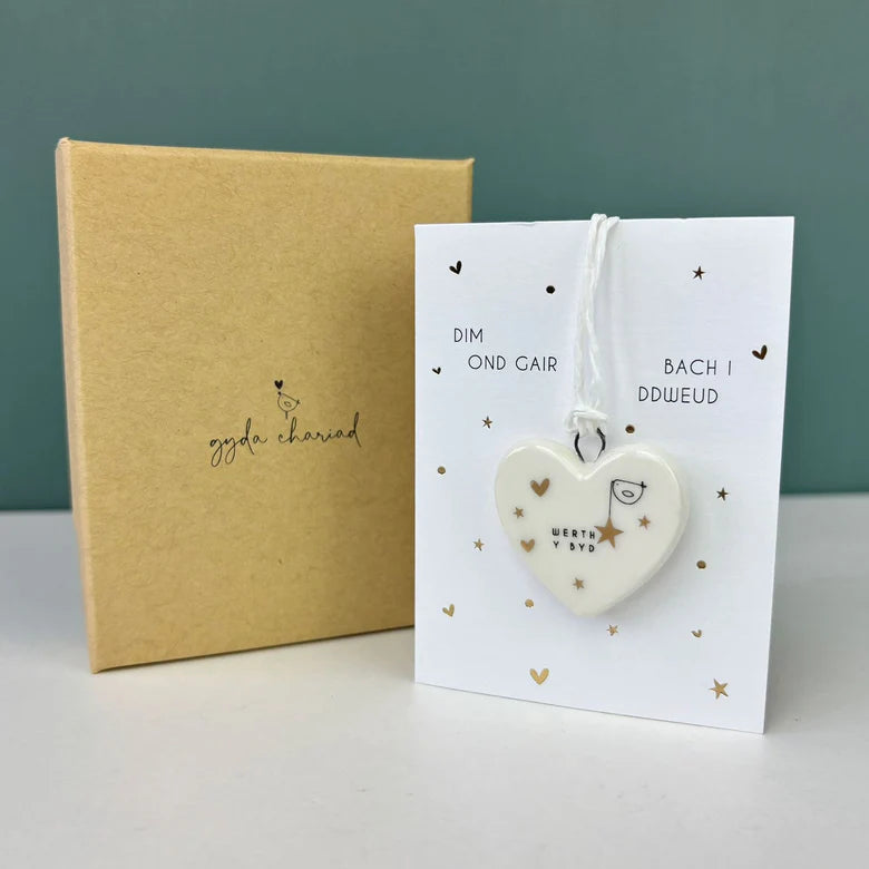 Ceramic heart decoration featuring the words 'Worth the World' in Welsh - Werth Y Byd, presented on a greeting card with the words 'just a little note to say' in Welsh - Dim ond gair bach i ddweud, complete with gift box.